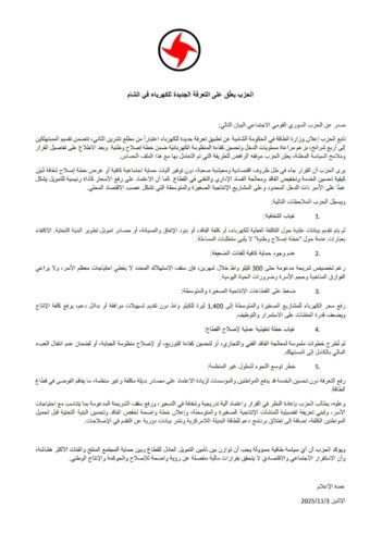 وعليه، يطالب الحزب بإعادة النظر في القرار واعتماد آلية تدريجية وشفافة في التسعير، ورفع سقف الشريحة المدعومة بما يتناسب مع احتياجات الأسر، وتبني تعريفة تفضيلية للمنشآت الإنتاجية الصغيرة والمتوسطة، وإعلان خطة واضحة لخفض الفاقد وتحسين البنية التحتية قبل تحميل المواطنين الكلفة، إضافة إلى إطلاق برنامج دعم للطاقة البديلة اللامركزية ونشر بيانات دورية عن التقدم في الإصلاحات.